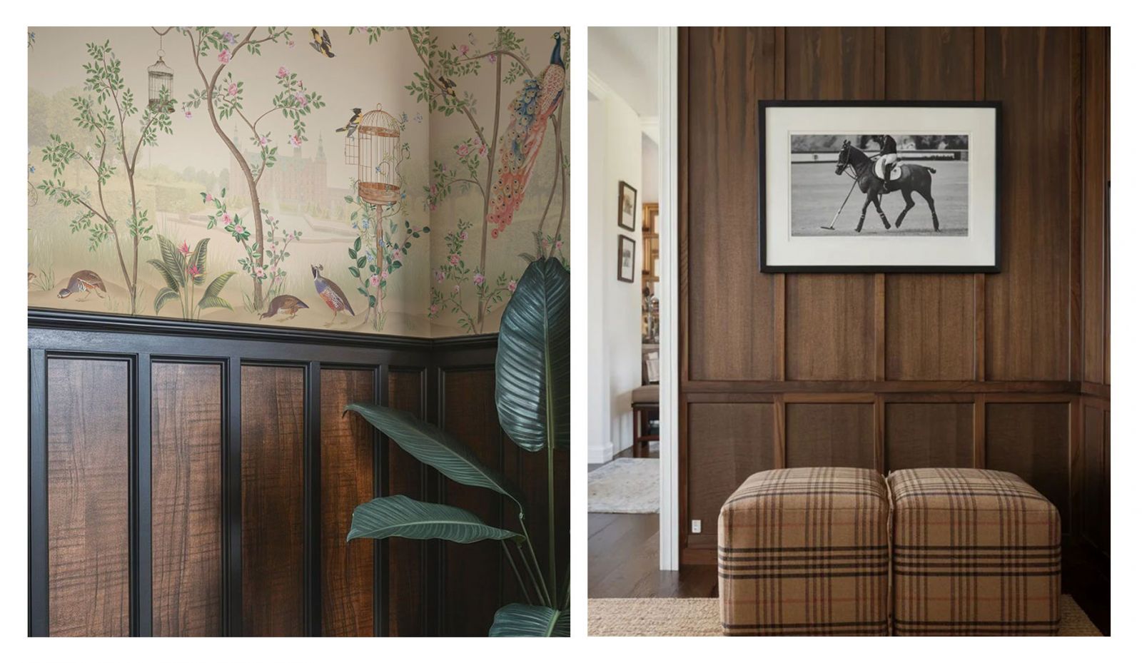 - «Стены пополам» - прием, когда отделка нижней половины стены выполнена из деревянных панелей, а верхняя обклеена обоями.
