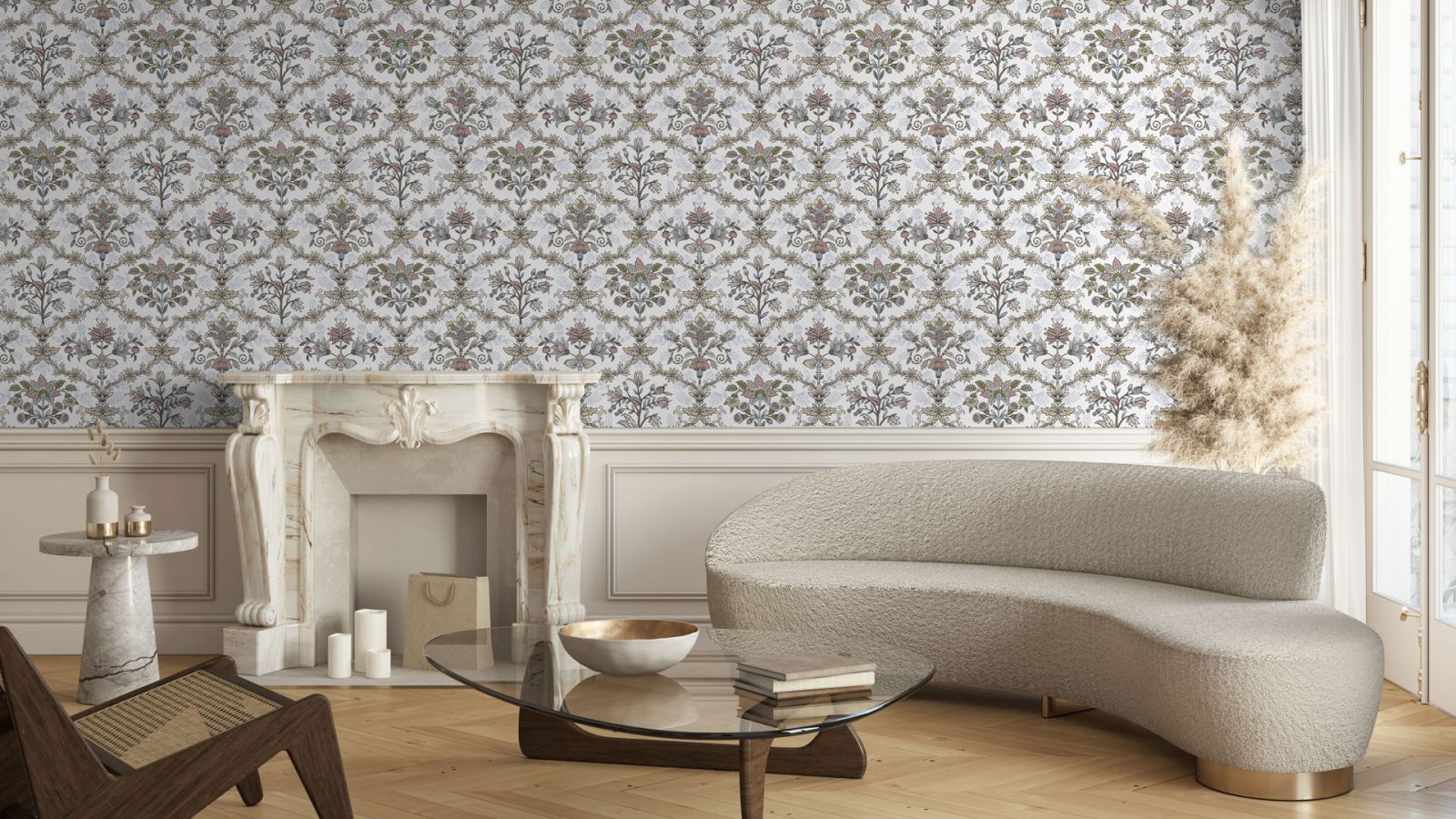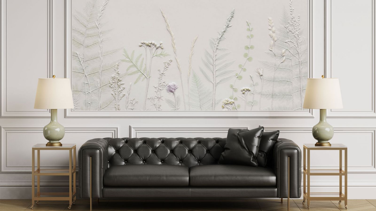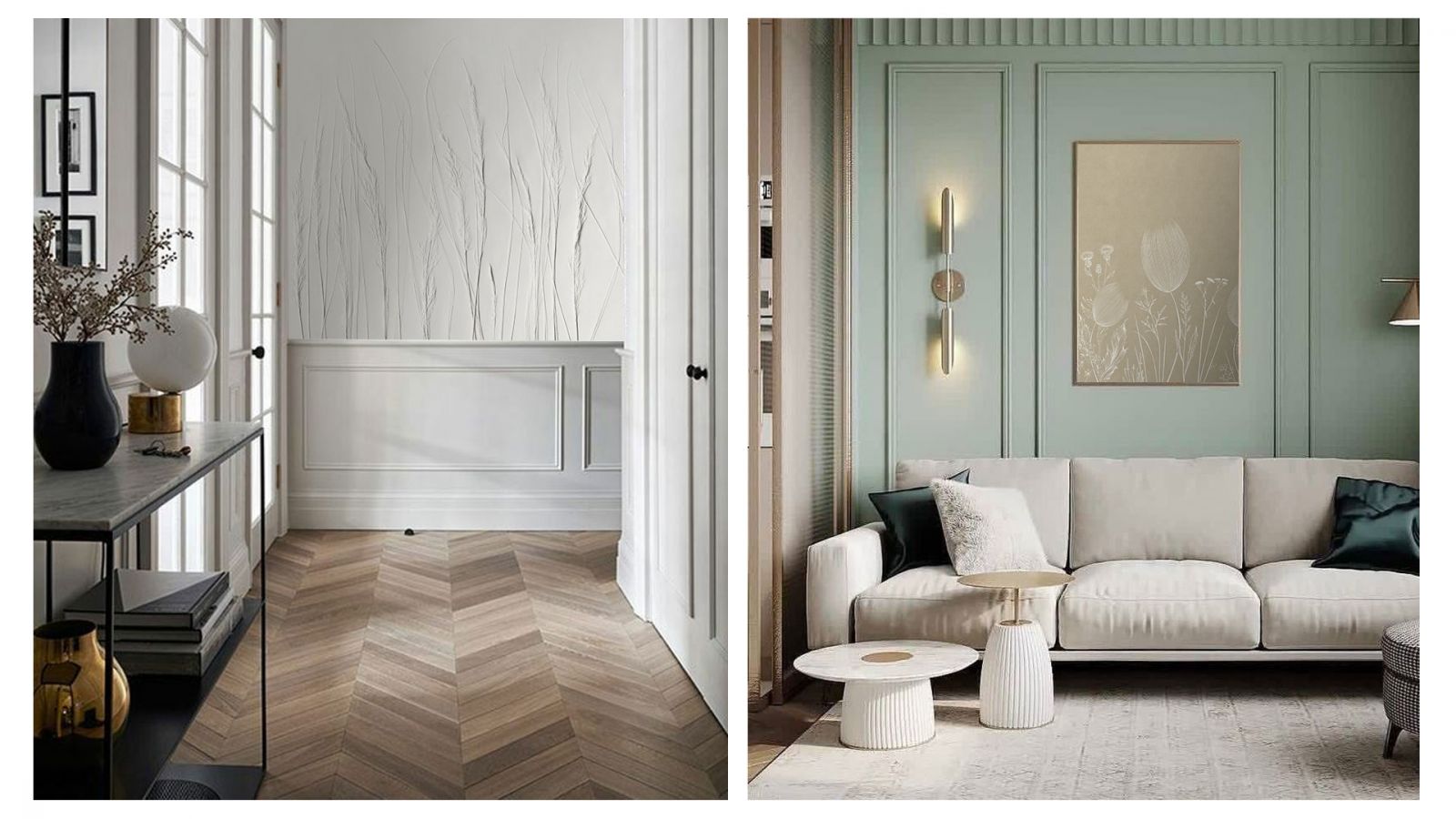 Как и несколько столетий назад, на полу в современном парижском стиле мы видим благородный деревянный паркет с узором «ёлочка». Это могут быть и более современные материалы (паркетная доска или ламинат), но обязательно тёплых древесных оттенков. Идеально, если напольное покрытие будет с эффектом благородной старины. Чтобы придать интерьеру многослойность и изюминку, можно на по положить ковёр. Во влажных помещениях (кухонной зоне, ванной) предпочтение отдаётся керамограниту и плитке светлых тёплых оттенков.