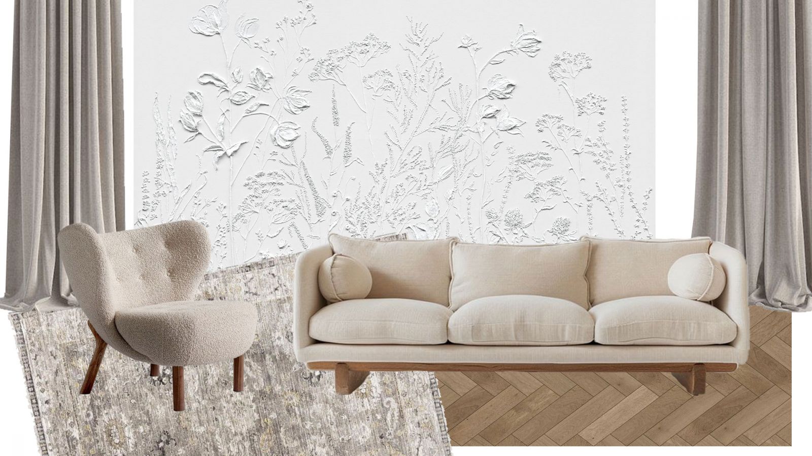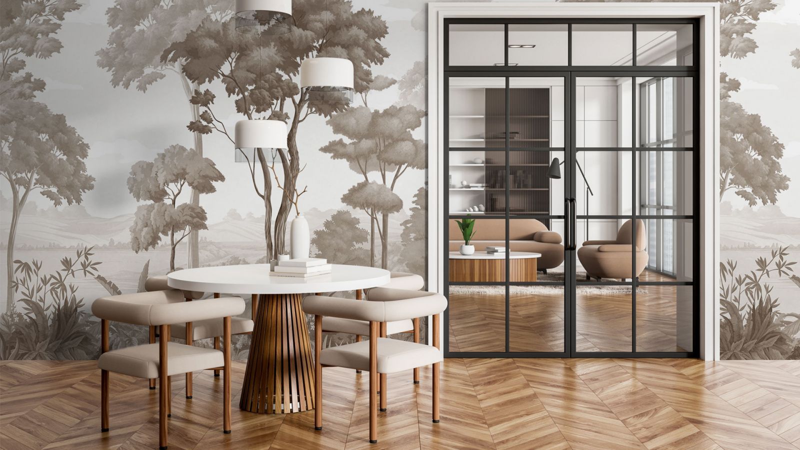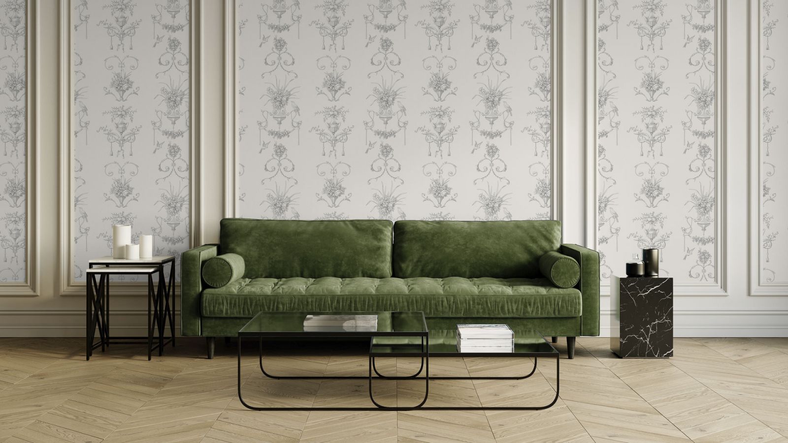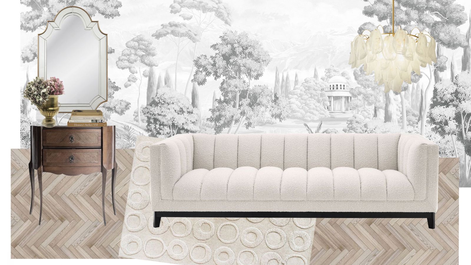 Как и несколько столетий назад, на полу в современном парижском стиле мы видим благородный деревянный паркет с узором «ёлочка». Это могут быть и более современные материалы (паркетная доска или ламинат), но обязательно тёплых древесных оттенков. Идеально, если напольное покрытие будет с эффектом благородной старины. Чтобы придать интерьеру многослойность и изюминку, можно на по положить ковёр. Во влажных помещениях (кухонной зоне, ванной) предпочтение отдаётся керамограниту и плитке светлых тёплых оттенков.